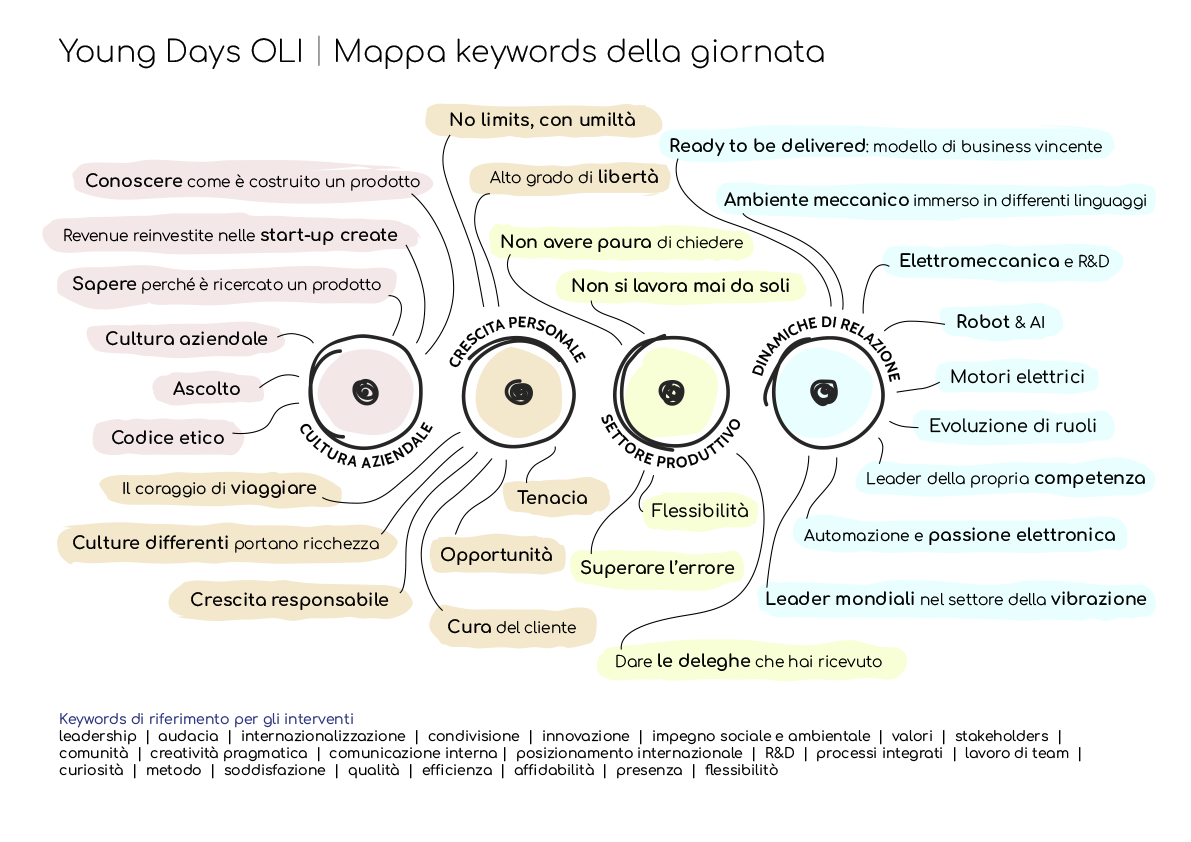La qualità del confronto ha creato un clima autentico di condivisione e ispirazione, in cui sono emerse parole chiave che raccontano perfettamente la realtà di OLI: leadership, tenacia, innovazione, crescita, ascolto,... raccolte in un'unica mappa keywords: